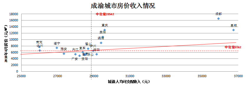 房价收入情况,在均值线下,居民收入较大且距离轴线向下偏离越大代表房价上涨潜力越强。重点关注城市有德阳、乐山、资阳、广安等;一般关注城市宜宾、内江、雅安等。