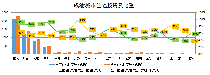 2016年成渝城市群住宅投资额为6740亿元,住宅投资额在均值251亿元以上的城市有4个,分别为重庆、成都、昆明及贵阳。整个城市群住宅投资额占房地产投资额比重为62%,市区住宅投资占全市住宅投资的79%。市区住宅投资占全市住宅投资低于50%的城市有:广安、南充、宜宾、眉山、内江及达州,以上城市所辖县级城市房地产投资较为活跃,应重点关注。