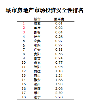成渝城市群城市房地产投资安全性综合排名TOP3的城市为:成都、重庆及昆明。偏离度大于1的城市投资风险较高,应谨慎投资,主要城市有遂宁、乐山、德阳、达州、雅安、眉山及内江。