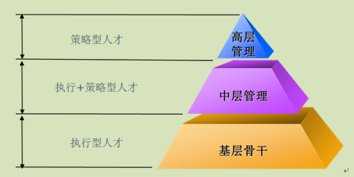 任用人才的最佳方式无疑是把合适的人才放在合适的位置上。我们可以在知人的基础上对人才进行分型,以分型的方式实现善任。对于营销体系而言,可以将人才分为执行型人才、执行+策略型人才、策略型人才三种类型,分别放到合适的层级上,具体如图3-1所示。