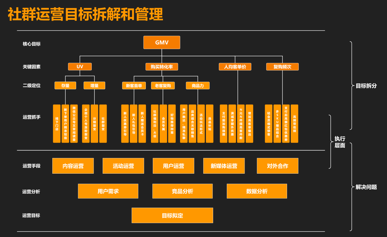 假设社群运营的目标是产品销售 GMV,那么这时候我们只需要去看,想要提升GMV,关键需要抓住哪些因素?