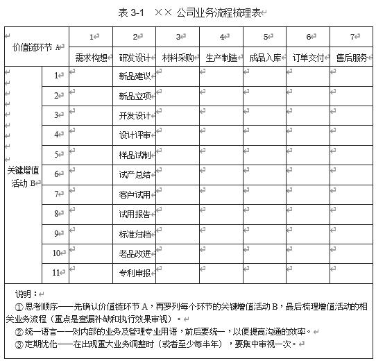 运用该业务流程问题分析表,基本上可以把企业价值链环节的所有流程都梳理出来,这样企业需要的各级业务流程清单就非常清晰了。