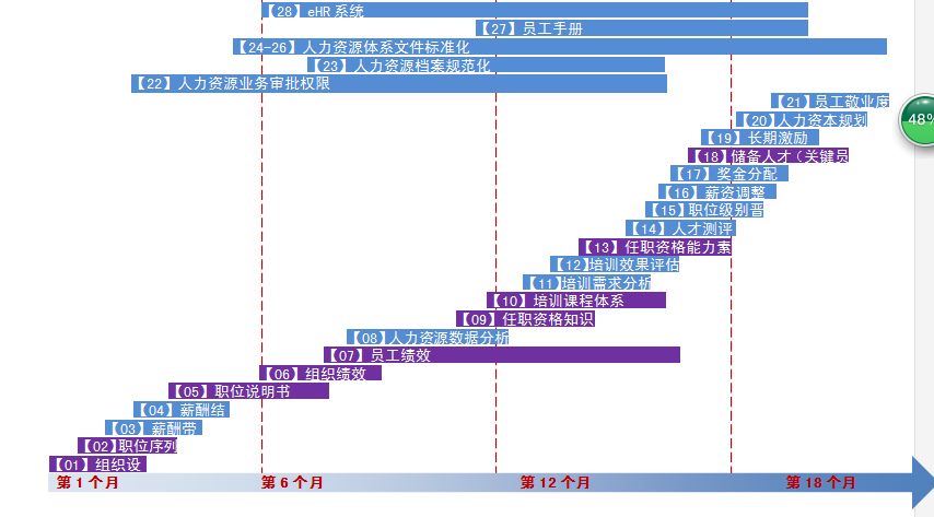 如上文体系全貌的介绍,所有关注点之间都存在着明确的输入、输出关系,因此在实施顺序上有着严格的要求。比如,要实施组织绩效,那么组织设置、职位序列、薪酬带宽、薪酬结构、职位说明书等的基础工作都是必须铺垫好的。