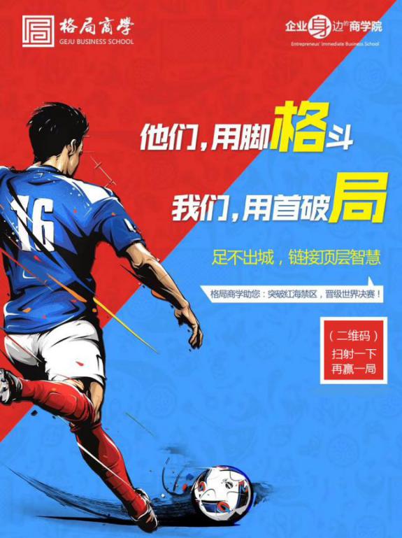 这是一家大咖云集的商学院,所以有别于逗趣型、搞怪式的风格,我们采取了稳健型的文案和设计调性。应景式主标,嵌入该商学院品牌名“格局”;辅助文案“格局商学助你:突破红海禁区,晋级世界决赛”,将赛事特点与商学院产品价值进行无缝结合。