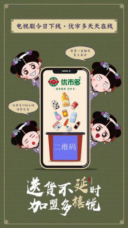 该海报结合平台“配送及时(送货不延时)、加盟有多项优惠政策(加盟多禧悦)”两大优点展开创意。这样植入还有一个好处是规避生硬植入引发的知识产权纠纷。