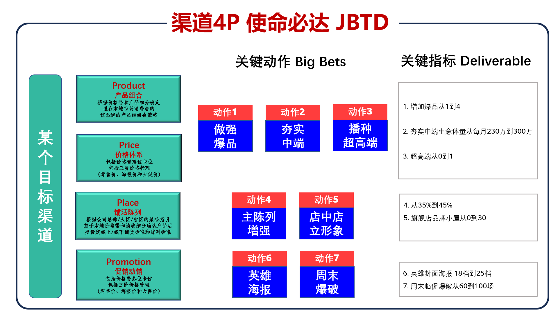 “在这个例子里,可以看到当地销售团队在‘Product —产品组合’和‘Price —价格体系’方面做了三个动作,分别是做强爆品、夯实中端品项和播种超高端品项。每个关键动作都用‘Big Bets’来形容就意味着每个动作的关键重要性,而‘Deliverable’则将进一步衡量每个关键动作的交付KPI。例如通过将每月合家欢中端价格带生意在今年年底前从目前每月的230万元提升到每月300万元就是考核‘动作2’的衡量KPI标准。值得注意的是,为了让选品更加高效和客观,该团队将‘Product —产品组合’和‘Price —价格体系’综合起来一起来做‘关键动作’的计划安排,这两个‘P’的确在实际相关工作中是无法区割开来的。在‘Place —铺活陈列’方面布置了两个核心动作——分别是‘主陈列增强’和‘店中店形象’,相对应的交付结果分别是‘主陈列增强’要从35%的货架占有率提升到45%、‘店中店形象陈列’要将‘品牌小屋’建设从目前没有启动到年底达标30个。最后关于第四个‘P’,‘Promotion —促销动销’则是通过‘英雄海报’与‘周末店内爆品’的执行动作来实现两个目标:一是合家欢封面海报从18档到25档;二是周六周日临时促销员爆破场次从60~100。”